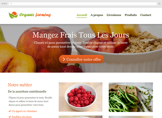 This theme filled with colors is perfect for product shop Organic, an organic café, delivery of fresh products at home and more. With a layout highlighting product images, you are on you customers will hang. Let people know about your business on the web, highlight your products and use our systems to allow your customers to order directly on your website.